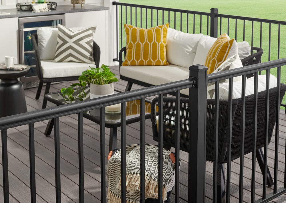 Key-Link American Series Aluminum Railing is featured on a deck with white railing and black balusters.